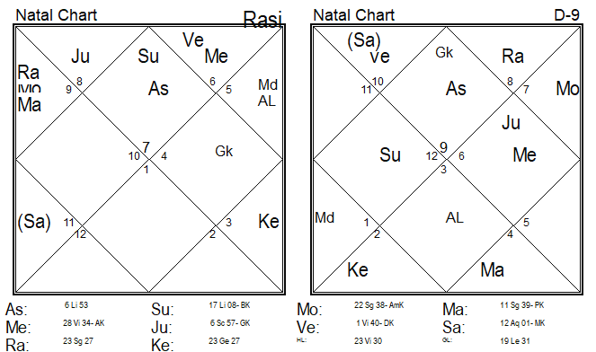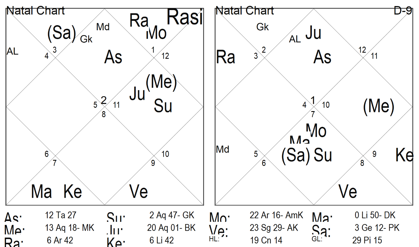 حکم زائچہ: زہرہ، شمس اور عطارد طالع کو قوی طور متاثر کررہے ہیں جبکہ زحل اور مشتری بھی طالع کو متاثر کر رہے ہیں چونکہ زحل نوانش میں حاکم طالع کے ساتھ ہے اور مشتری حاکم طالع کو ناظر ہے۔ صاحب زائچہ کا رنگ صاف، درمیانے قد اور خوبصورت شکل ہوگا اور ظاہری شکل عام طور پر جوان ہوگی۔ وہ انسانی فطرت کا گہرا مشاہدہ کرتا ہے۔ وہ آسانی سے استدلال کے قابل نہیں ہے اور سوچے سمجھے انداز میں آزاد جذبہ ظاہر کرے گا۔ زہرہ کی مہاء دشاء میں زحل کی انتر دشاء پیدائش کے دوسال بعد تک چلے گی جس میں صاحب زائچہ ٹائیفائیڈ اور ملیریا کے بخار سے شدید متاثر تھا۔زہرہ آٹھویں گھر کا حاکم بھی ہے جوکہ نحس ہے۔ قمر، مریخ اور راس کا قران جذباتی پریشانیاں ظاہر کرتا ہے ۔